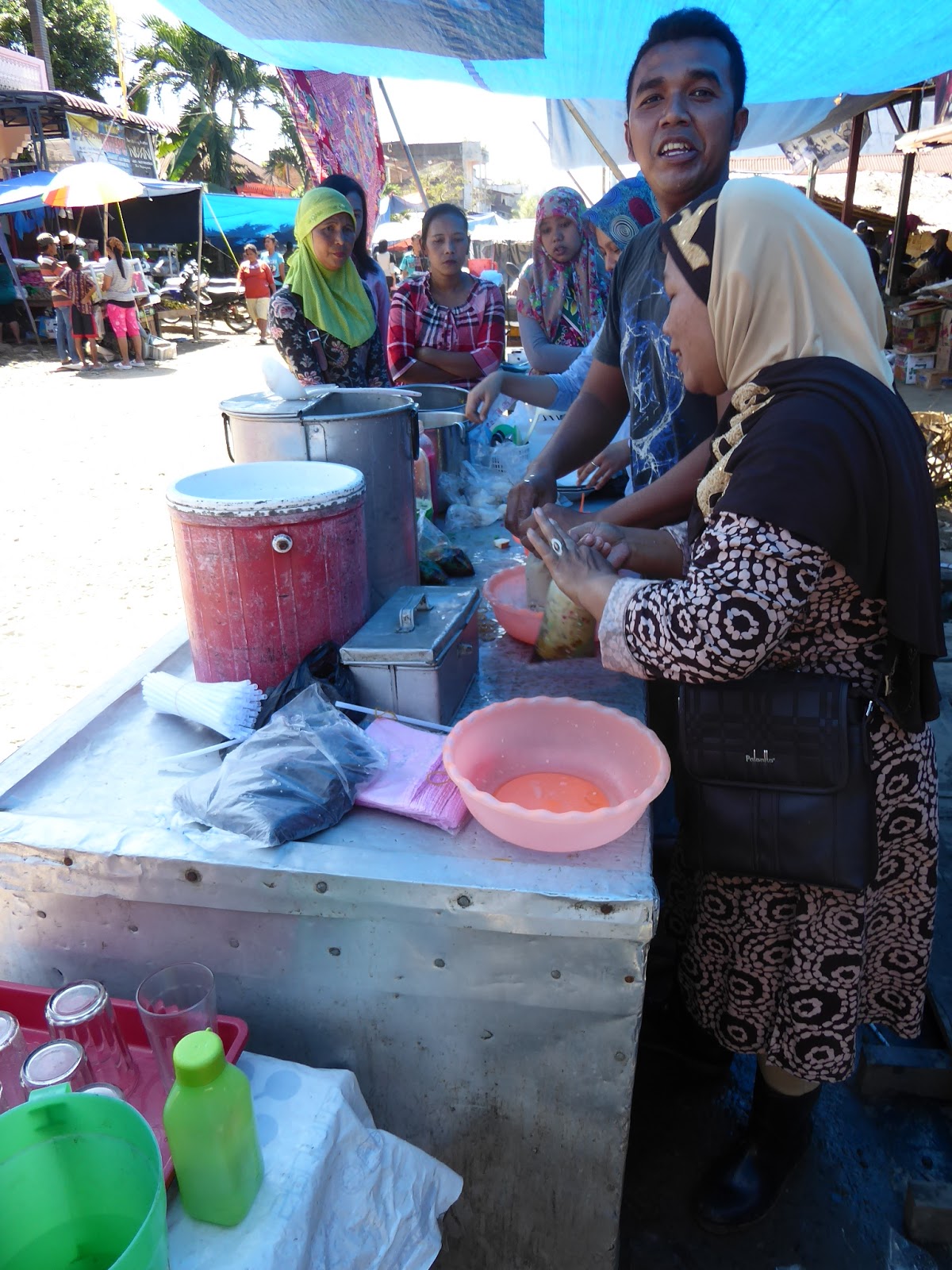 Pasar....drinks. Below: sugar cane crusher machine possibly to make fresh syrup for drinks. It goes well with ice and has been enjoyed in an infrequent purchase that breaks all the tourist rules.